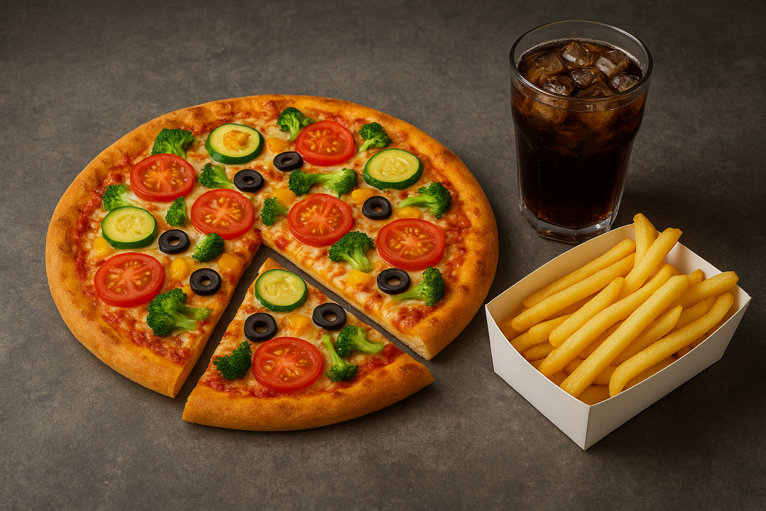 Enjoy the perfect meal with our delicious Veg Pizza Combo, packed with vibrant flavors and ultimate satisfaction. A soft, cheesy veg pizza loaded with juicy tomatoes, crunchy broccoli, fresh zucchini, black olives, and melting mozzarella—baked to golden perfection.